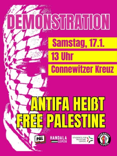 Für den 17. Januar mobilisiert ein Bündnis in Solidarität mit Palästina und gegen den Genozid durch Israel zu einer Demonstration nach Connewitz. Es rufen palästinasolidarische antifaschistische, kommunistische, anarchistische und autonome Gruppen auf. Im Aufruf werden das Conne Island, das Linxxnet und Juliane Nagel als Akteurinnen benannt, die mit der Demo in Connewitz adressiert werden. Diese Akteurinnen fallen anhaltend durch verbale Angriffe gegen palästinasolidarische Menschen und Gruppen auf. Zudem werden im Aufruf körperliche Angriffe in Leipzig Connewitz gegen palästinasolidarische Menschen thematisiert.