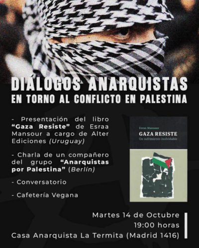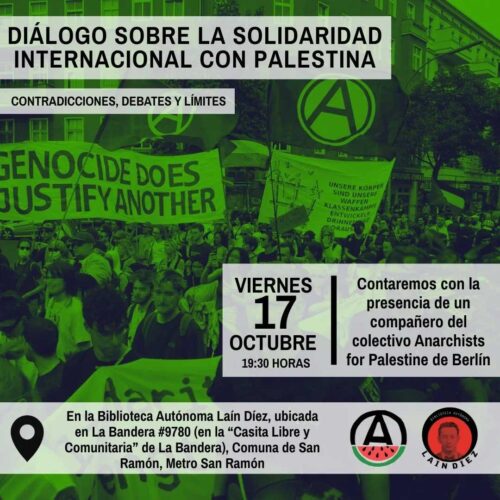Es bajo esta lectura que como casa Anarquista la Termita queremos intencionar un debate que aborde el conflicto en Palestina aprovechando dos presentaciones que permitan, por una lado, contextualizar el presente de asedio y resistencia en Gaza, y por otra parte, conocer la experiencia de solidaridad con Palestina de compañerxs anarquistas en Alemania