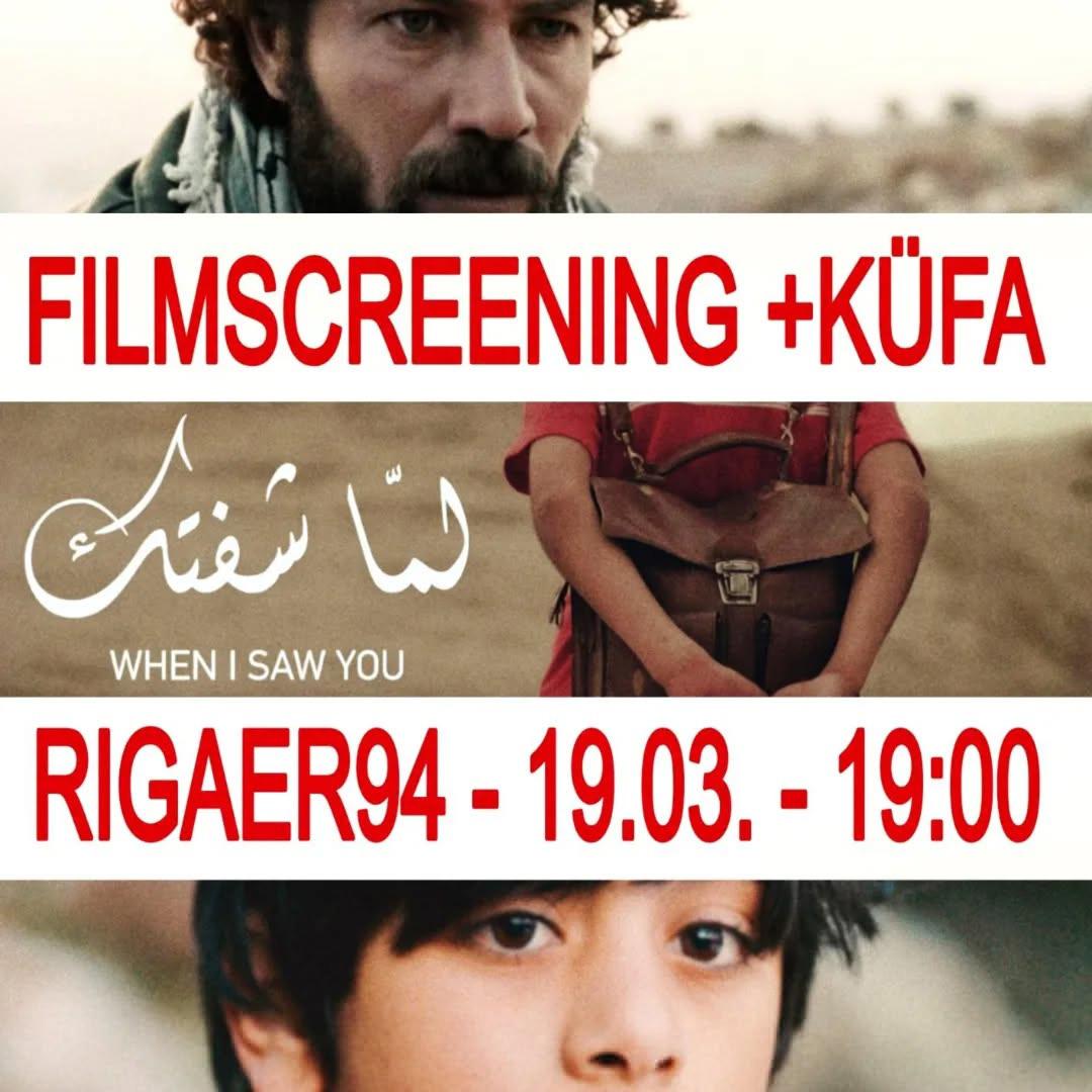 Thursday, the 19.03. in Rigaer Straße 94 we want to come together at 19:00 to watch the film “When I saw you”. The movie follows Tarek, a young Palestinian boy who has to flee together with his mother to Jordan in 1967. Having been separated from his beloved father, Tarek has difficulties adjusting to the life in the refugee camp, and decides to leave the camp on his own to look for his father. On this journey he meets a group of like-minded people of revolutionaries with whom he embarks on a journey that will change their life.