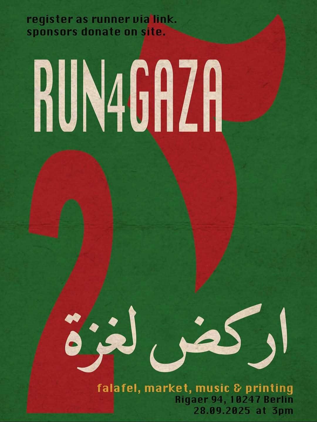 Exactly one year ago on 29th of September 2024 the first successful RUN4GAZA benefit event in Berlin-Friedrichshain took place. Many participants managed to run multiple rounds and have been cheered by crowds of people along the route. To the story belongs, that the cops went mad during the last running round and interrupted the run by trying to chase some runners.