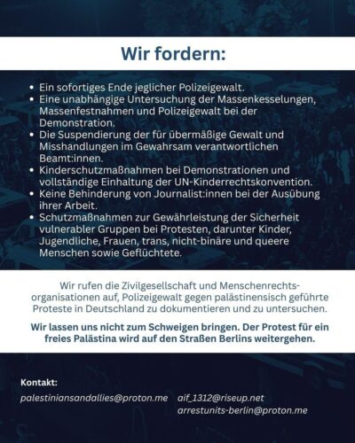 The contact by mail and the social media accounts are only associated with this blog (“#anarchists4palestine – autonomous and anarchist pro palestine blog”), and not with any group or network. (Public PGP key: Anarchists4Palestine-Berlin_pub.asc)