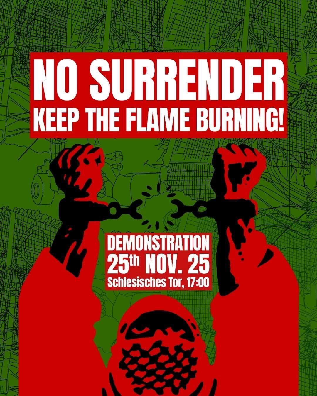 Aber der Kampf gegen Imperialismus, Zionismus, Kapitalismus und Patriarchat lässt sich nicht einsperren. Sie können unsere Flammen niemals gefangen halten. Aus jedem Knast und Kerker überall auf der Welt hallt eine Wahrheit wider: Unsere standhaften Kämpferinnen haben uns gelehrt, dass „Widerstand nicht vergeblich ist… sondern ein Leben in Ehre und Würde” und dass „Menschen, die sich weigern aufzugeben, mit ihren eigenen Händen Wunder vollbringen”. Sie erinnern uns daran, dass Gerechtigkeit nicht geschenkt wird. Sie muss eingefordert und erkämpft werden.