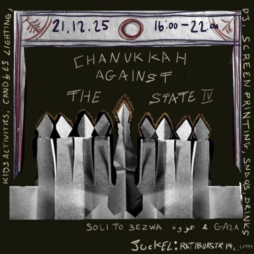 Join us as we light the eighth Chanukkah candle together on Sunday 21 December and show solidarity with the people of Gaza and those who continue to face state repression for fighting for a free Palestine!