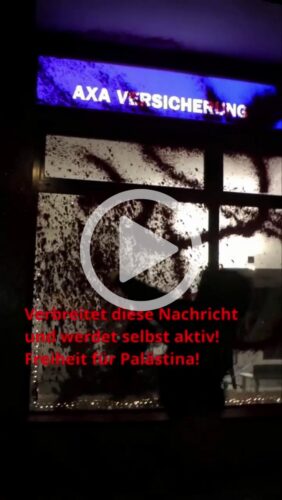 EILMELDUNG: Eine autonome Gruppe in Berlin greift eine Filiale der Versicherungsgesellschaft AXA an, die weiterhin in mehrere große Unternehmen investiert, die die Besatzung, Apartheid und den Völkermord in Palästina ermöglichen.