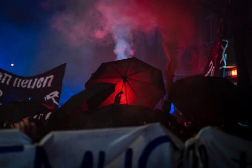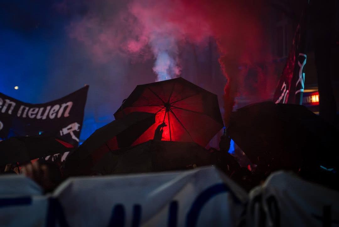 Durch vorherige Taschenkontrollen gab es bereits bevor die Demo los ging erste Festnahmen. Ein immenses Polizeiaufgebot begleitete die Demo fast durchgängig im Spalier gefolgt vom Lärm des Bullenhubschraubers.