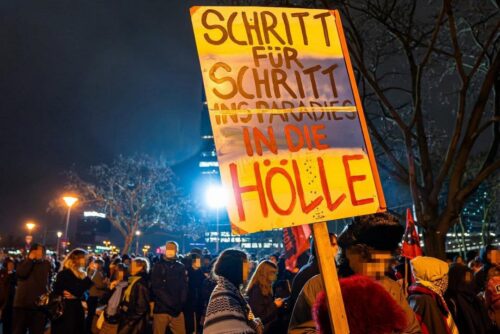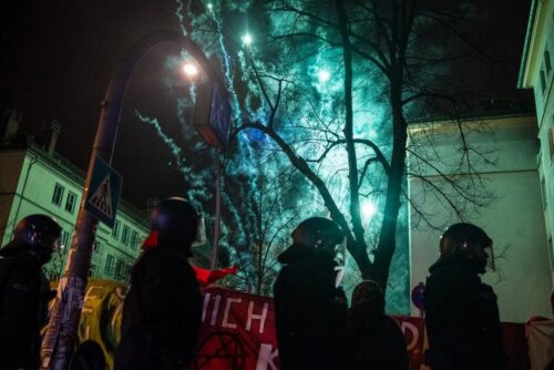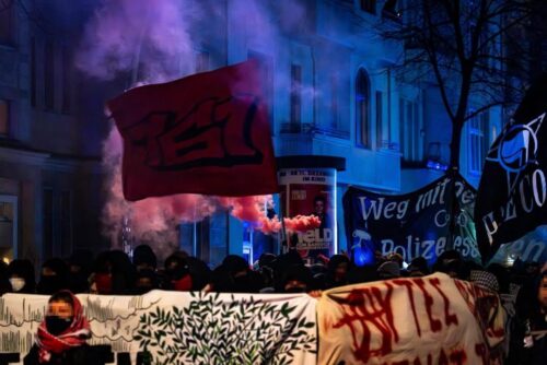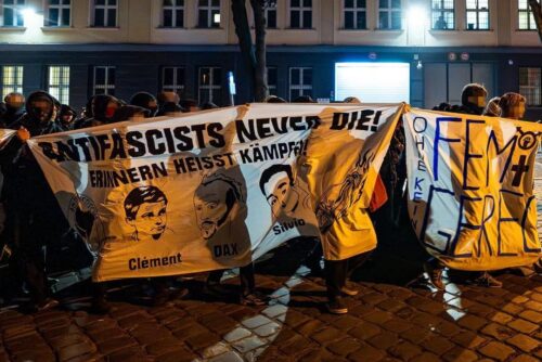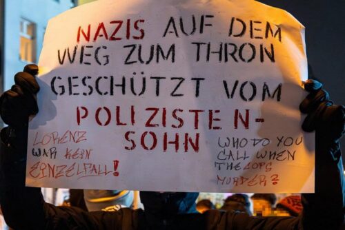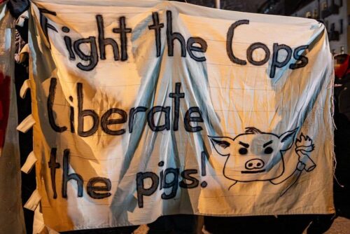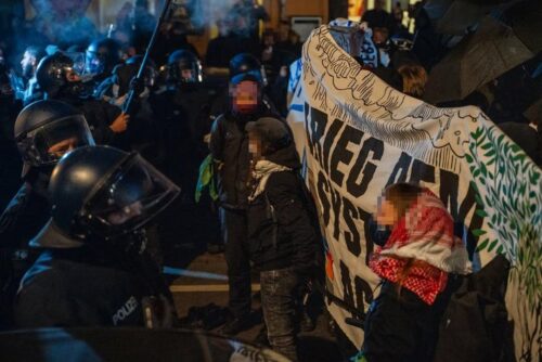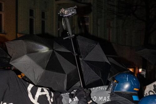 Die Bullen wurden zum vorzeitigen auflösen unserer Demo sehr kreativ und prangerten das Rückwärts fahren des Lautis als Begründung für den Stopp der Demo an, später folgte dann auch noch die Durchsage, dass Mützen, Corona-Masken, Schals und Transparente verboten seien, da sie die Identität verschleiern würden und bei Nichteinhaltung mit Festnahmen zu rechnen sei. Daraufhin folgte am Anfang der Rigaer Str. eine Prügelorgie der Polizei bei der mehrere Teilnehmende kurzzeitig bewusstlos geprügelt wurden und es zu zahlreichen Festnahmen kam.