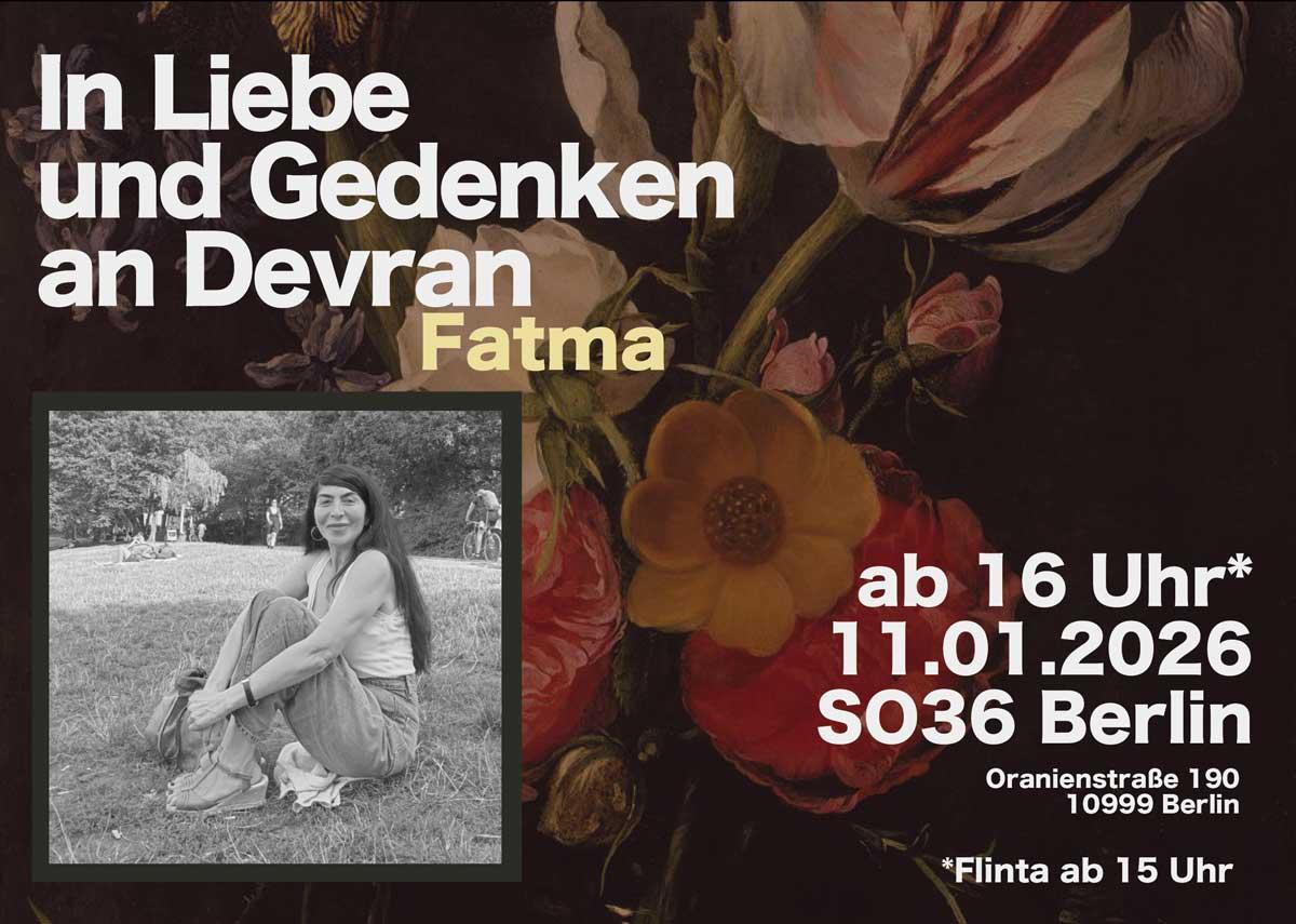Am Sonntag 11. Januar ab 16 Uhr (ab 15 Uhr für Flinta) wollen wir im SO36 unserer Freundin und Gefährtin Devran (Fatma) gedenken. Wir laden euch herzlich ein und wer möchte, kann sich gerne mit einem persönlichen Beitrag beteiligen. Wenn ihr etwas beitragen wollt, schreibt gerne an gedenken_an_devran@proton.me. Es wird Essen, Musik, Fotos und Beiträge zu Devran geben.