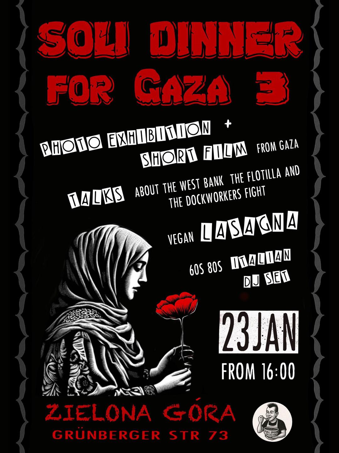 Third edition of our soli lasagna dinner for Gaza – come to support, all incomes will go to soup kitchen projects in Gaza.