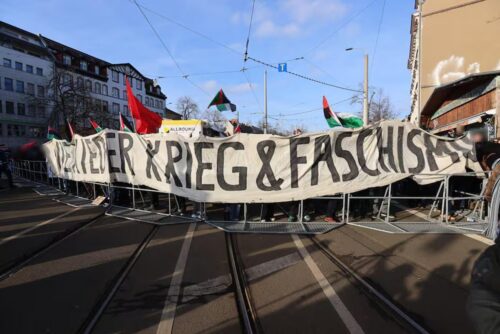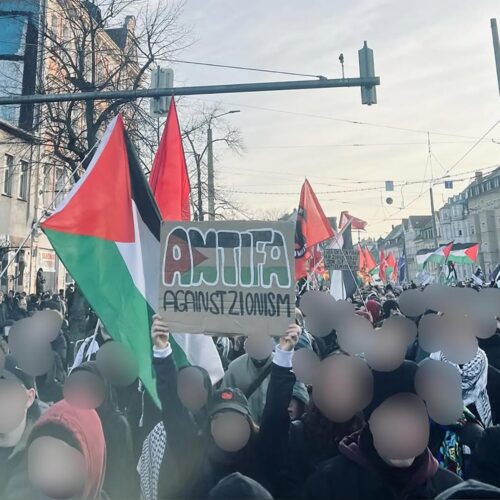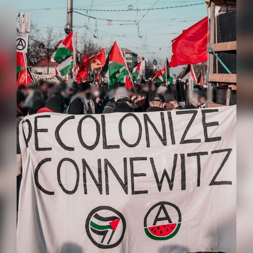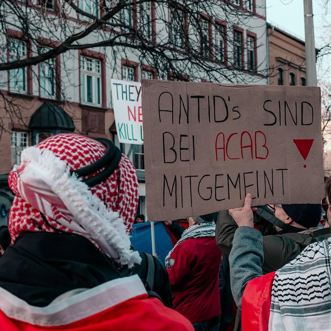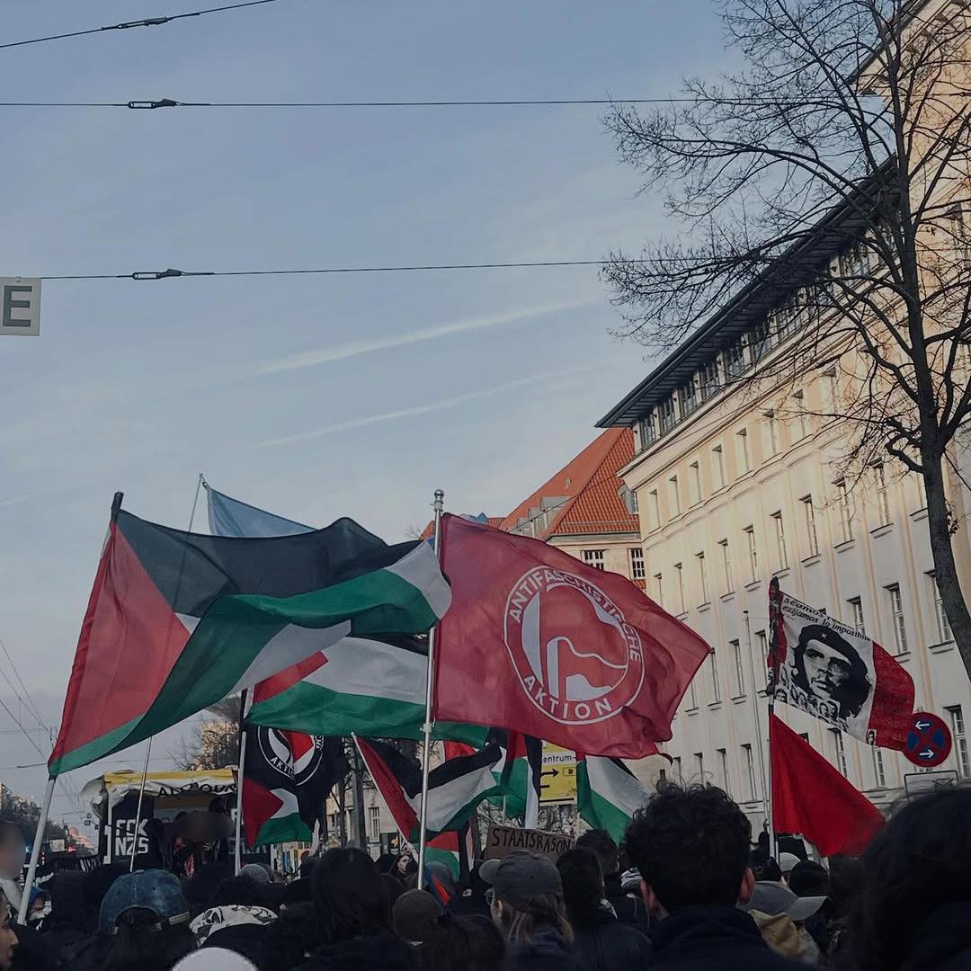ich denke, ich brauche euch nicht von neu auf an zu erzählen warum wir heute hier sind. Ich denke ich brauche euch nicht zu erzählen wie lang schon dieser Genozid andauert, wie viele Palästinenserinnen auf brutalste Art gestorben sind und wie viele an Hunger und Kälte leiden. Ich brauche euch auch nicht zu erzählen wie viele Genossinnen hier und auch weltweit Hass, Morddrohungen oder Repressionen abbekommen, weil sie in ihrem Aktivismus drauf aufmerksam machen. Wir alle kennen die Bilder, Videos und Erfahrungsberichte aus Gaza und der Westbank und haben, im Vergleich zur braunen rassistischen Suppe dahinten, verstanden, wofür wir uns einsetzen und wen wir unterstützen. Wir alle wissen aber auch, dass wir mehr sind, in unseren Kollektiven zusammenhalten und uns nicht einschüchtern lassen. Die Waffen der Zios sind der IDF Fetisch, Rassismus, Springerpresse und bürgerliche Kapitalparteien. Unsere Waffe ist stärker und sie wird auch immer die Stärkste bleiben, nämlich die Solidarität.