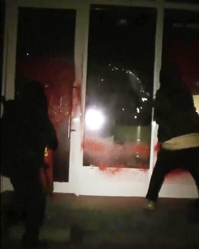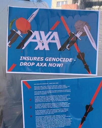 With posters, paint and broken glass the autonomous group sends a clear message to AXA: divest from ALL companies enabling genocide. They demand AXA customers to dump them as their insurer, and to spread the word and take action themselves!