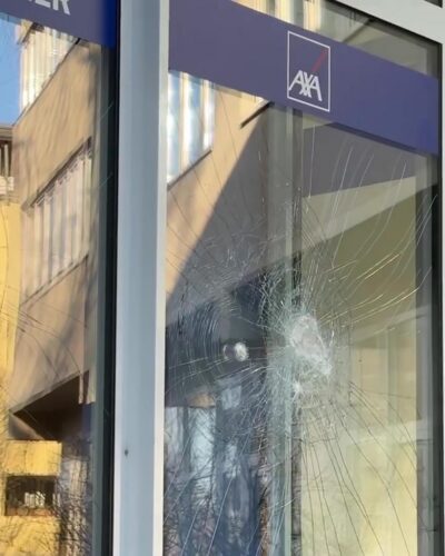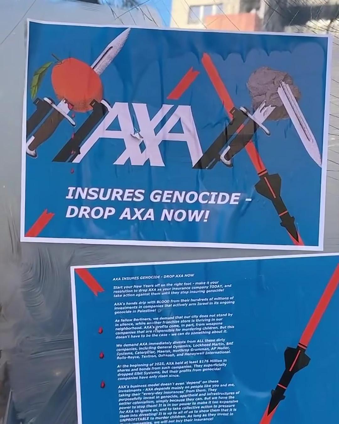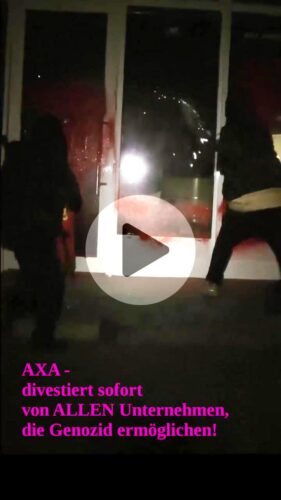 Mit Postern, Farbe und gebrochenen Fenstern setzt die autonome Gruppe ein klares Zeichen: divestiert von ALLEN Unternehmen, die den Völkermord ermöglichen. Und sie fordern AXA-Kund:innen dazu auf, dem Versicherungsunternehmen zu kündigen, die Nachrich zu verbreiten und selbst aktiv zu werden!