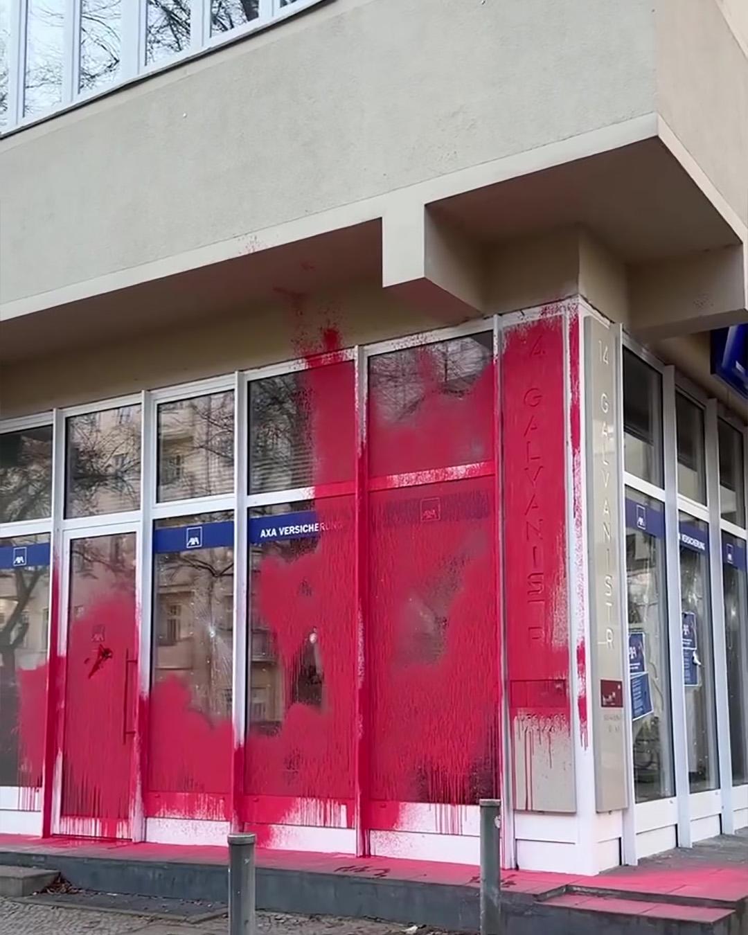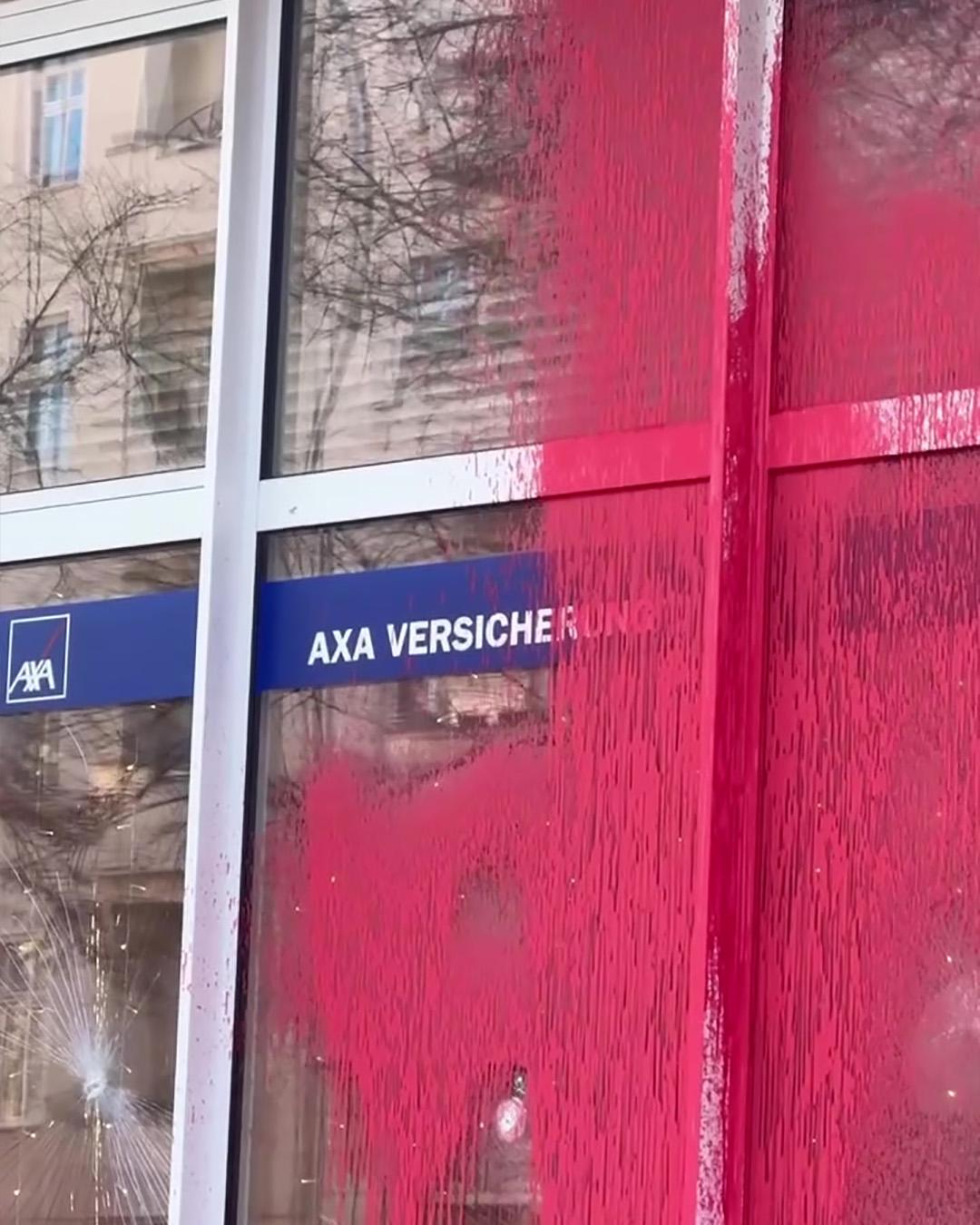 EILMELDUNG: Anonyme Aktivist:innen greifen ein AXA Buero in Berlin an. Die Versicherungsgesellschaft investiert in Unternehmen, die die illegale israelische Besatzung, Apartheid und den Völkermord in Palästina ermöglichen. Es hat bereits mehrere Aktionen gegeben, die AXA fuer ihre tiefe Mitschuld zur Verantwortung gezogen hat. Das scheinheilige Fallenlassen des israelischen Waffenkonzerns Elbit Systes (nur durch kontinuierlichem Druck) ist nicht genug!
