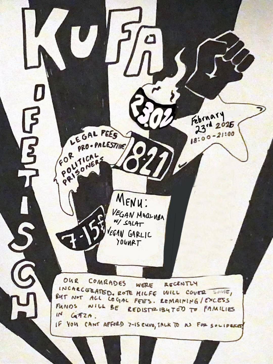 We are organizing a Küfa to support political prisoners who stand against the regime and the state rationale of Israel and Germany. These individuals fought and were recently incarcerated for their brothers and sisters in Palestine.