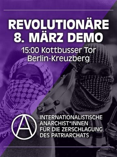 „Wir folgen dem Beispiel unserer Geschwister aus dem Globalen Süden und weigern uns, den Kampf gegen das Patriarchat vom Kampf gegen Imperialismus, Kapitalismus, Kolonialismus und jegliche staatliche Gewalt zu trennen. Ihr Kampf ist unser Kompass. Schließt euch uns auf der Straße an für die diesjährige revolutionäre 8. März Demonstration. Lasst uns laut und deutlich sein: Wir sind nicht hier, um zu verhandeln, sondern um zu eskalieren. Nicht um zu reformieren, sondern um zu stürzen.
