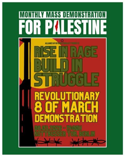 Normalerweise findet jeden ersten Samstag im Monat die monatliche Massendemonstration für Palästina in Berlin statt. In diesem Monat – März 2026 – ruft die monatliche Massendemo zur Beteiligung an der Revolutionären 8. März Demonstration auf, am 8. März ab 15:00 Uhr Kottbusser Tor.