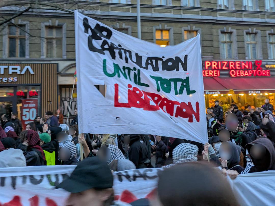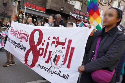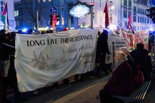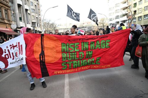 Die Demonstration „Rise in Rage” brachte verschiedene internationalistisch-feministische Gruppen zusammen, ebenso wie Initiativen, die gegen den Krieg und für Palästina auf die Straße gehen. Iran, Kuba, Rojava, Gaza und Libanon standen bei dieser Mobilisierung, die größtenteils von Migrant*innen getragen wurde, im Mittelpunkt.