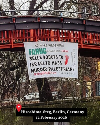 Activists in Berlin (Germany) dropped a banner on Berlin’s Hiroshima-Steg footbridge (down the street from the Japanese embassy and from the Memorial to Anti-nazi Resistance in Germany) in the early hours of Feb. 12th, 2026, the International Day of Action to #StopFanucNow, calling out FANUC’s complicity in the genocide. FANUC has multiple locations in Germany, incl. its head office near Stuttgart and technical centers in Dusseldorf and Hamburg.
