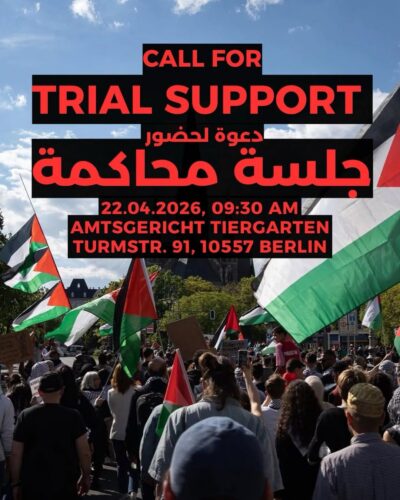Nearly two years later, Berlin’s courts are still busy criminalizing our protests—while Germany’s role in the zionist-U.S. genocide hasn’t changed at all. The killing now affects even more people than it did then.