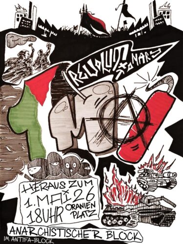 Neben vielen anderen sehr wichtigen Themen werden auch der anhaltende Genozid gegen die Palästinensische Bevölkerung und der Widerstand gegen die kolonialen/ imperialistischen Kriege in allen Aufrufen zu den diversen Blöcken – wie unter zum Anarchistischen Block im Antifa-Block in der 1. Mai Demo – thematisiert. Außerdem wird jetzt – kurz vor knapp – auch zu einem Palästina-Block aufgerufen.